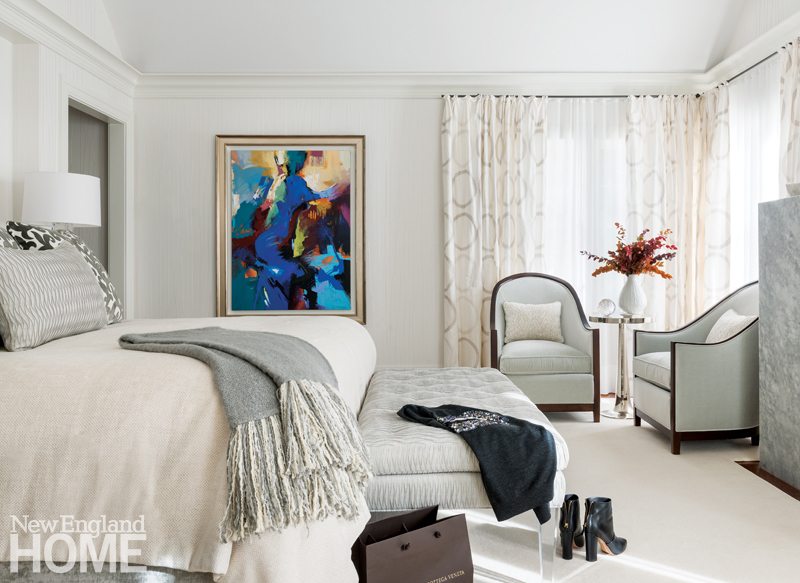 The second floor holds two guestrooms for out-of-town visitors. Polletta has brought as much charm to these as she has to the kids’ rooms and their parents’ private quarters. In the master bedroom, an opulent Ulf Moritz wallcovering by DL Couch magnifies the light. Subtly textured, the couture backdrop complements a Lucite bench and a silver trumpet table—contemporary contrasts to the prim armchairs and ladylike chaise alongside the fireplace. A moody abstract painting is the sole spot of color.