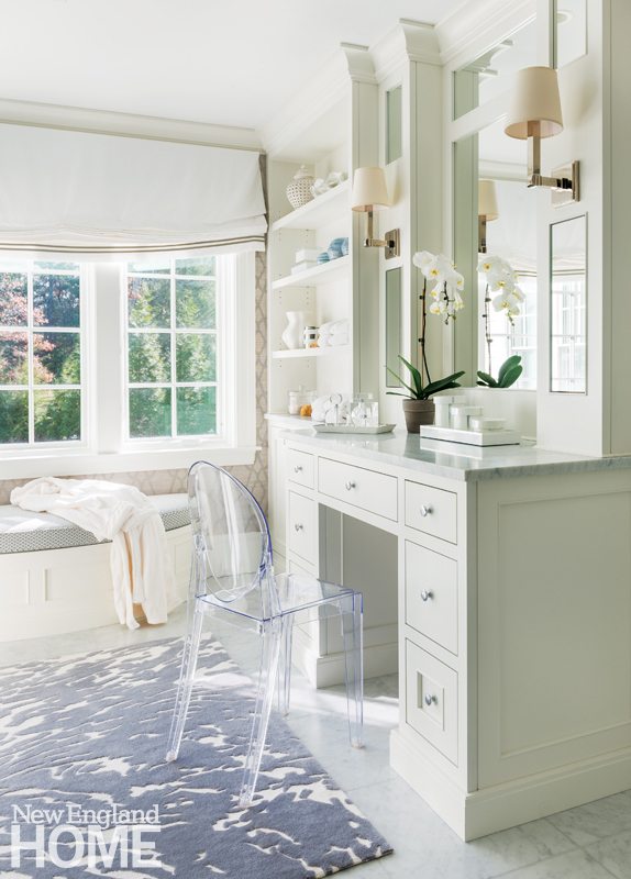 To facilitate grooming (and a happy marriage, according to many), the couple enjoy his and hers baths and dressing rooms. A large glass shower in between serves as the link. Twin built-in mahogany armoires designate Dad’s quarters, while Mom’s realm is as feminine as they come, with a marble-topped vanity and a chic and cozy rug.