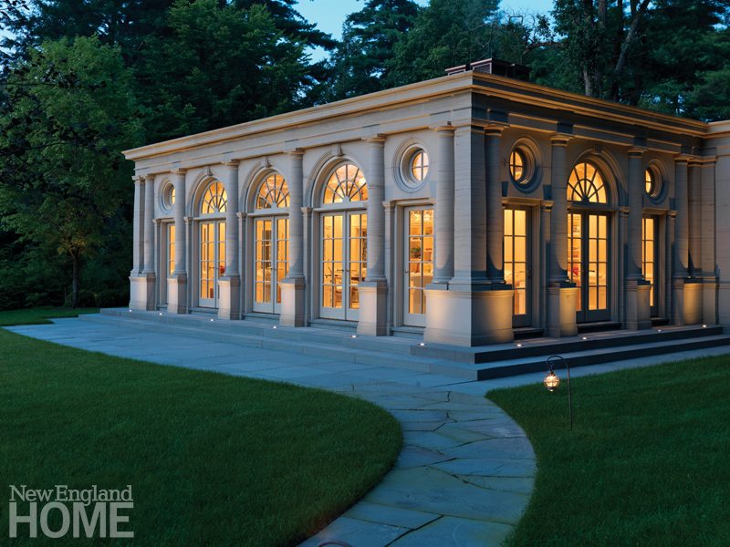 A garden pavilion in the neoclassical style makes a gracious addition to a Chestnut Hill, Massachusetts, property.