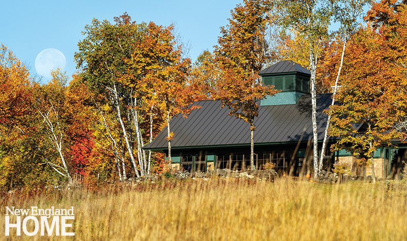 Expansive twenty-four-foot-wide-by-eleven-foot-tall steel bifold doors open to reveal an oasis suited to both quiet relaxation and large gatherings of friends and family. “It’s a social space,” says Smith, “but the homeowner also wanted this cozy aspect to it.” The pool, which boasts sweeping views of Mount Ascutney, takes all of this into consideration with a lap lane, kiddie area, spa, and oversized steps for sitting and soaking.