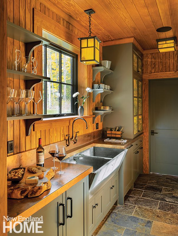 In addition to having all of the necessary amenities at arm’s reach, craftsmanship was paramount. Smith and Branchflower devised an arts and crafts-inspired interior that has a beautiful hand-crafted quality. No detail was overlooked—from the Douglas fir backdrop, sweeping trusses and all, to the custom copper circular chandeliers above the pool, to the meadow-inspired mosaics in the inglenook, to the custom-designed layout of the Youghiogheny art-glass tiles, to the copper that graces the kitchen countertops and coffee table.