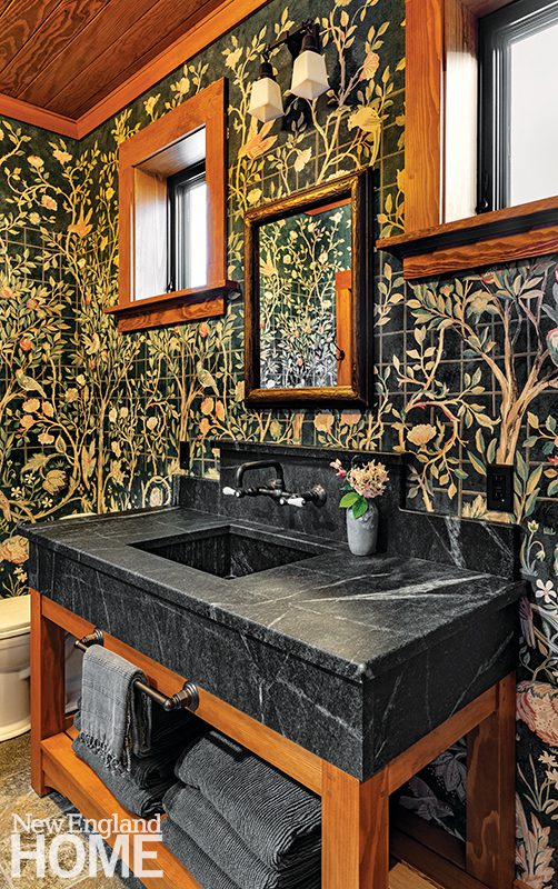 Just beyond the pool is an inviting octagonal inglenook with banquette seating (“one of the more complicated built-ins we’ve done,” notes Branchflower) and a stone fireplace. There’s also a kitchenette complete with a 100-year-old salvaged soapstone sink, a sauna, changing rooms, laundry, and a bathroom swathed in a lush William Morris wallpaper.