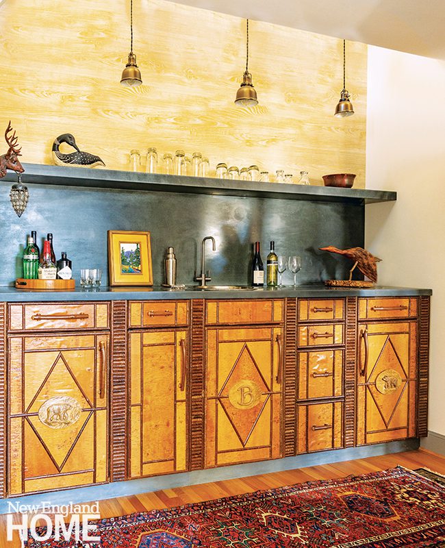 Throughout the project, Shulman and Finkenzeller sought to bring the outside in by using natural materials, ranging from yellow-pine paneling on the walls, to newel posts topped with granite spheres on the stairway, to a custom Adirondack-inspired bar designed by Anto Parseghian of Abiding Branches. That showpiece features a zinc counter and cabinetry crafted from birch bark and willow and birch twigs.