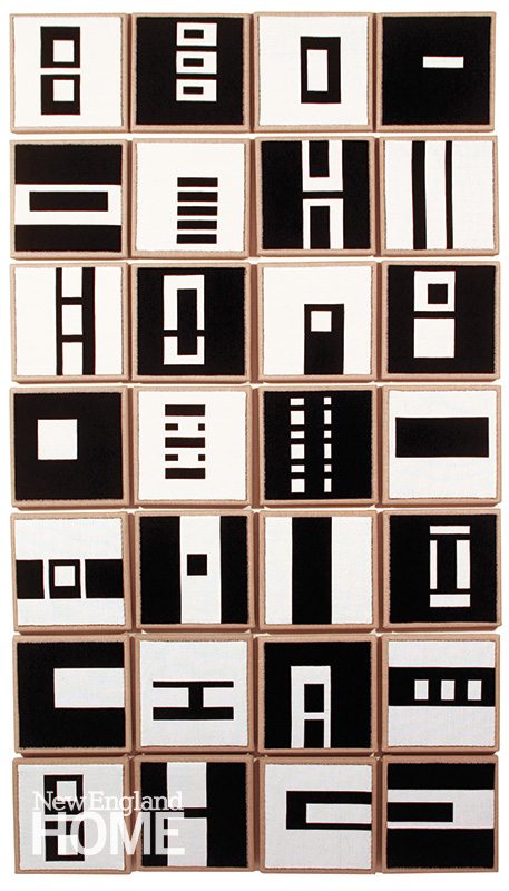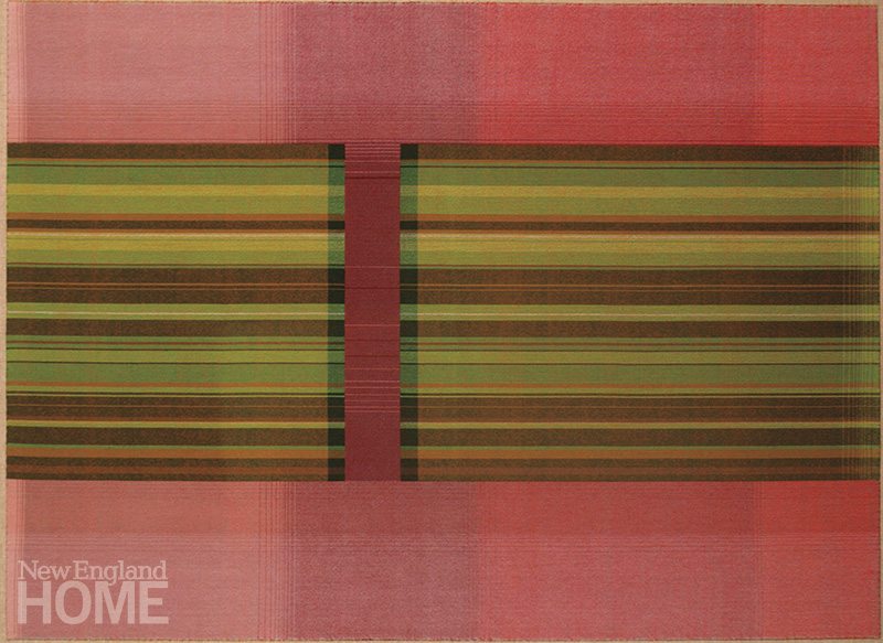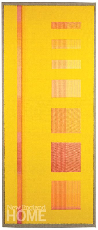 Whether she is inspired by the sunset while crossing the Sagamore Bridge or a newspaper clipping of Buddhist monks in red robes, she distills that inspiration down to its most elemental, abstract, non-emotional composition. For her, the graphic and sometimes bold style makes the best use of the weaving medium. “I like the crispness, I like the hard edge,” she says. “It fits with the structure.”