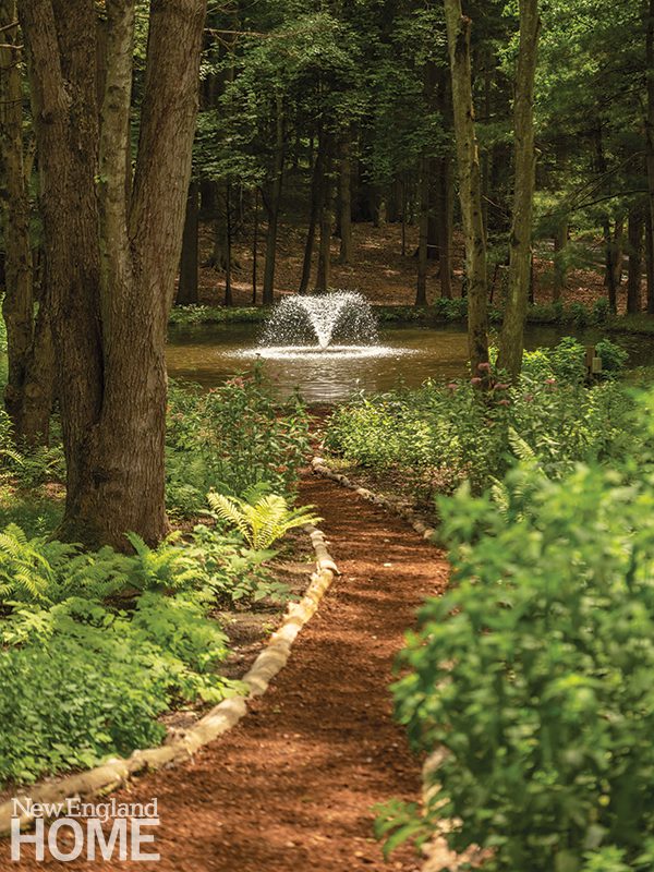 The back of the house is dedicated to experiencing the great outdoors. The green-roofed pergola and pool overlook huge swaths of native pollinator-friendly perennials that lead to a woodland walk that loops around the property, a beloved family activity. Beyond, the landscape incorporates a gentle pond.