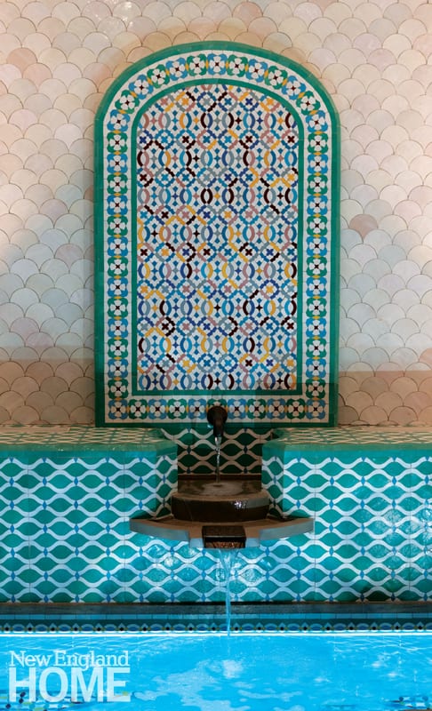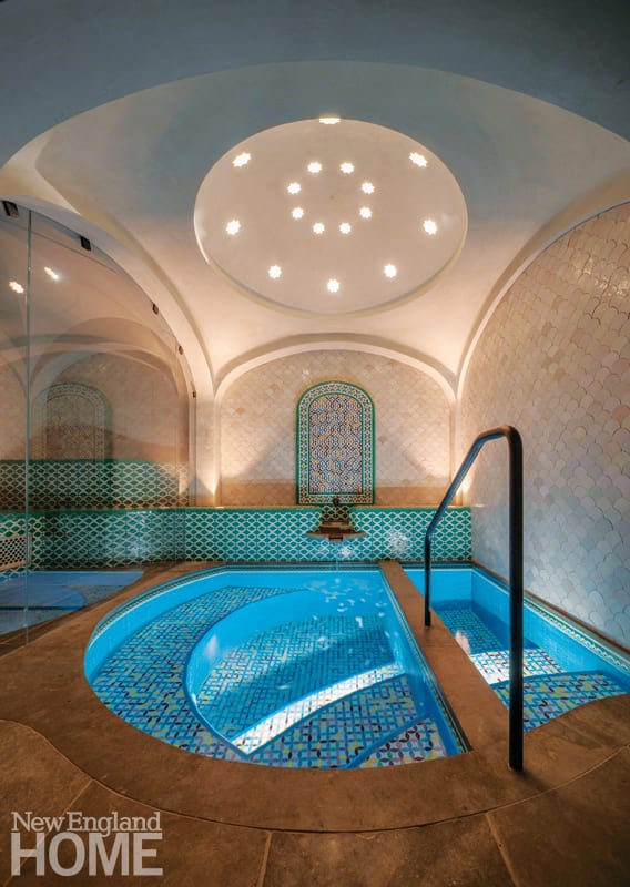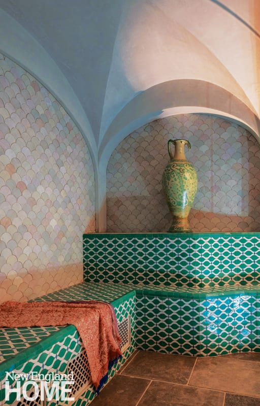 It turns out that building a hammam—a Turkish bath—below ground in a Cambridge backyard is no small feat. Just keeping the team of pros straight required a spreadsheet: First came DiLazzaro, landscape architect Matthew Cunningham, and architect Don Knerr, then came eleven engineers (specializing in everything from mechanical and structural to geotechnical, thermal analysis, and waterproofing); countless suppliers for things like custom glass fixtures, scene lighting, sound, and tile; and more than a dozen artisans and finishers who handled tasks such as specialty plastering, iron and stone work, and constructing water features. Planning was paramount because the emphasis was on custom and handmade. Case and point, all the Moroccan tile had to be ordered before the team even broke ground.