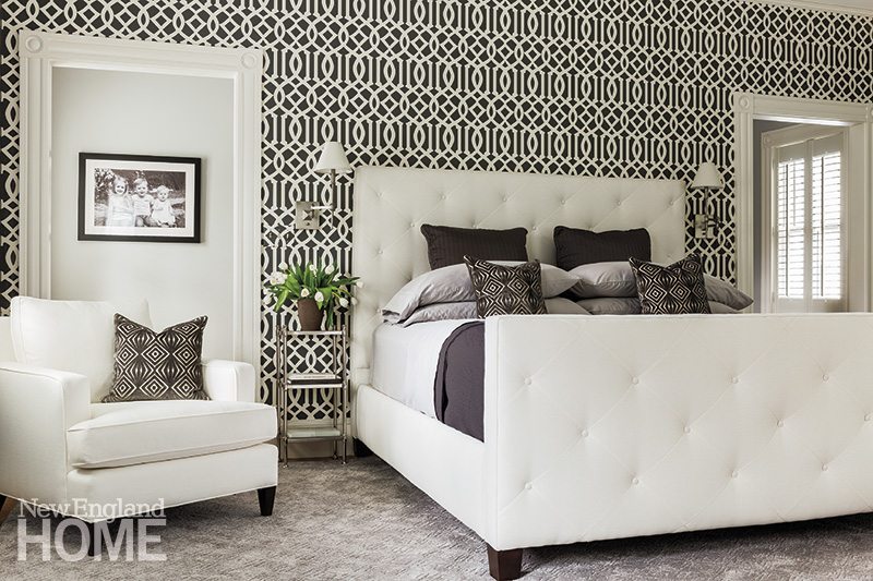 The master bedroom shows how all these elements come together. The charcoal-and-white Imperial Trellis wallpaper by Kelly Wearstler behind the bed is something of a masterstroke. “I knew Meghan really didn’t like patterns, but I need to push clients out of their comfort zones now and then, and this time it worked,” says Langlois. “She loved this geometric design.”