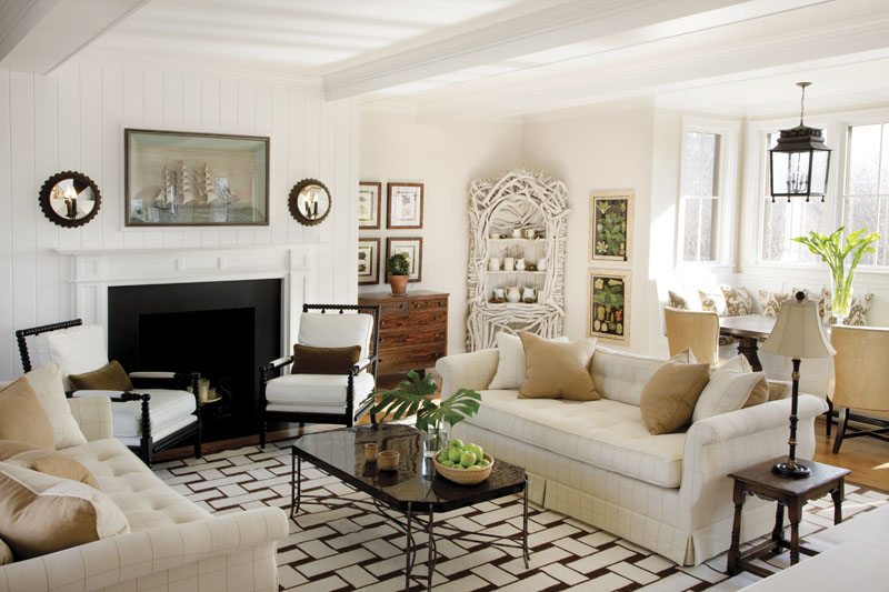 Allen not only built the house from the ground up, that’s the way she decorated it as well. “I started with a rug for each room, which dictated the color scheme and style,” she says. A custom Jonathan Adler chocolate-and-ivory basket-weave rug sets a neutral tone in the open living/dining space. Below a coffered ceiling, twin cream-colored sofas face each other in front of the fireplace, over which a ship shadow box is recessed into the wall. Matching bobbin chairs round out the comfortable, relaxed seating area. There is no formal dining room; rather, a trestle table perches in front of a wrap-around window seat banquette.