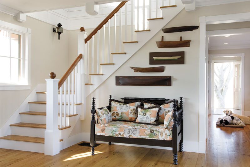 Two steps up and overlooking the living/dining area, the kitchen sits awash in Carrara marble countertops and white cabinetry that was custom made by Nantucket-based Hoff Woodworking. The kitchen island’s mahogany top boasts a high-gloss boat finish, courtesy of Allen’s husband. “Mike’s a boat builder on Nantucket,” says Allen. “He builds boats one at a time, just like I do with the houses, and he winds up selling them when he’s done, too.”