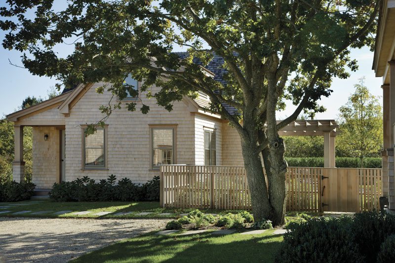 A pea stone driveway leads up to the house and loops around, where the front yard is planted with deer-proof foliage. The property, which sits at the end of a rural road, is home to a stand of mature trees that Allen fought to preserve. One in particular, an imposing, beautiful English white oak, sat in the middle of the compound. “It took everything I could do to protect it from people driving into it, taking big machines and ripping off branches by mistake or running over the root system,” says Allen. “But the tree was so beautiful and probably seventy-five years old—which is rare on Nantucket—that I did everything I could to save it.”