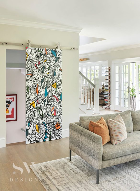 In the living room, the pop of color took the form of a sliding door, which leads to the home’s basement. Instead of the usual rustic barn door, SV Design hired a local graffiti artist to create a custom mural on the door. “It incorporates words and pictures that the clients came up with that are meaningful to them. It’s a contemporary piece of art but also something that is very personal,” Littlefield explains. “They love it.”