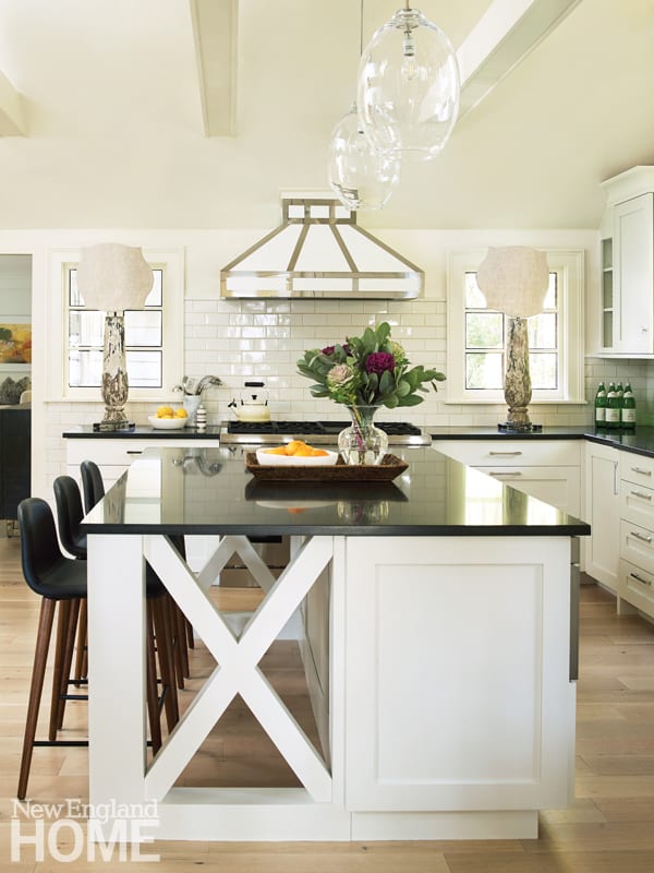 “It had a lot more of a traditional look,” says FORM partner and design chief John Leontiou. “We modified it to make it more updated and contemporary.” They started in the kitchen, flipping its orientation for a more efficient use of space, and then expanding the opening into the den. In the den, they added a zero-clearance fireplace flanked by bookshelves and raised the ceiling, giving character to exposed structural beams by cladding them in reclaimed barn wood. In the living room, they converted the wood-burning fireplace to gas and replaced two small windows with a larger one, brightening the space. The front foyer got a black-and-white harlequin tile floor. Upstairs, they enlarged the master closet and reworked the layout in the bathroom, adding an elegant freestanding tub.