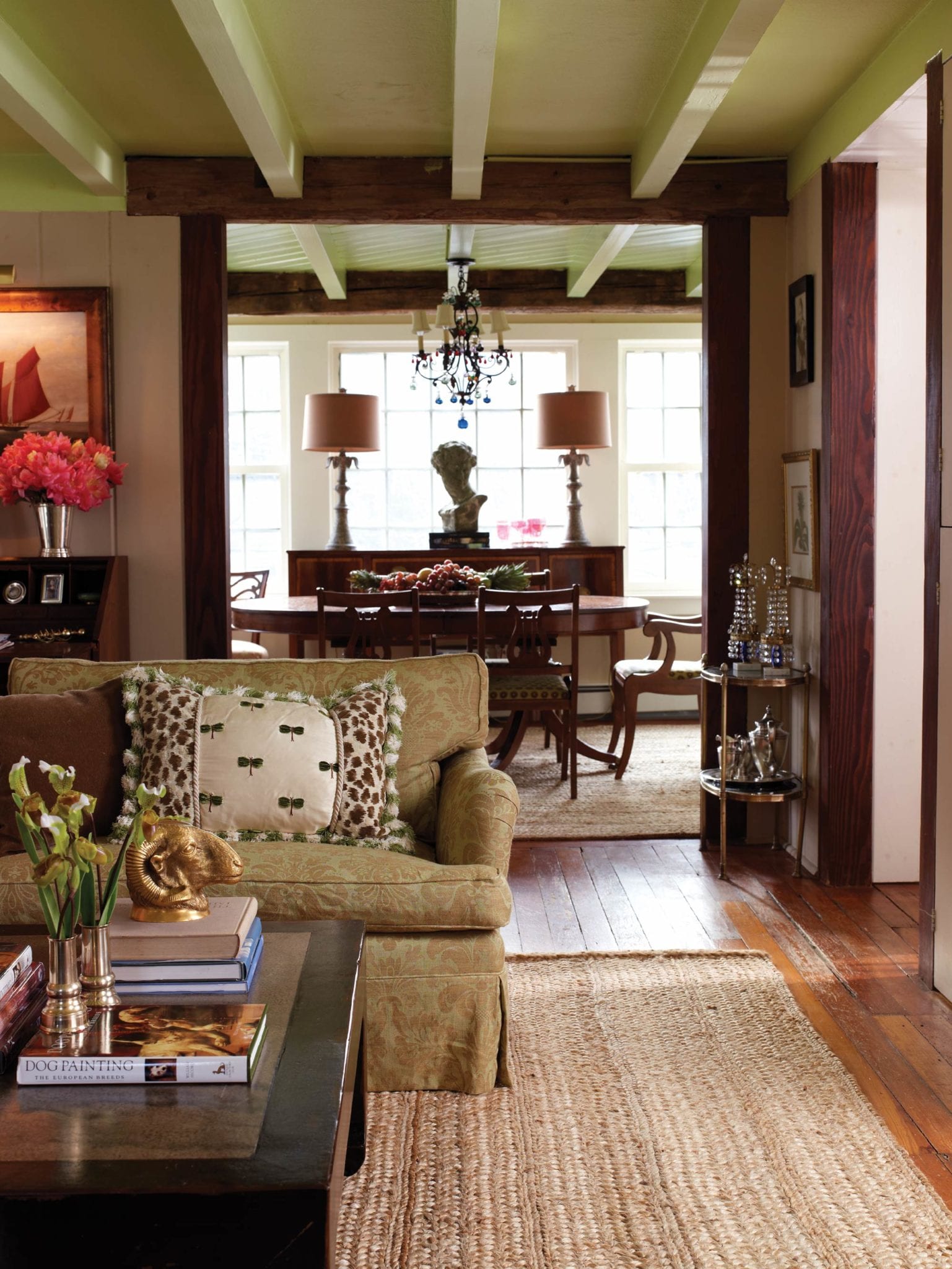 The dining room pulls double—make that triple—duty as breakfast room, homework station and formal dining area. Karlan barely had to touch the kitchen, merely painting the Klaff’s cabinetry. As for the conservatory, it makes the perfect display case for an enormous Christmas tree during the holidays and a bright painting studio for Karlan the rest of the year.