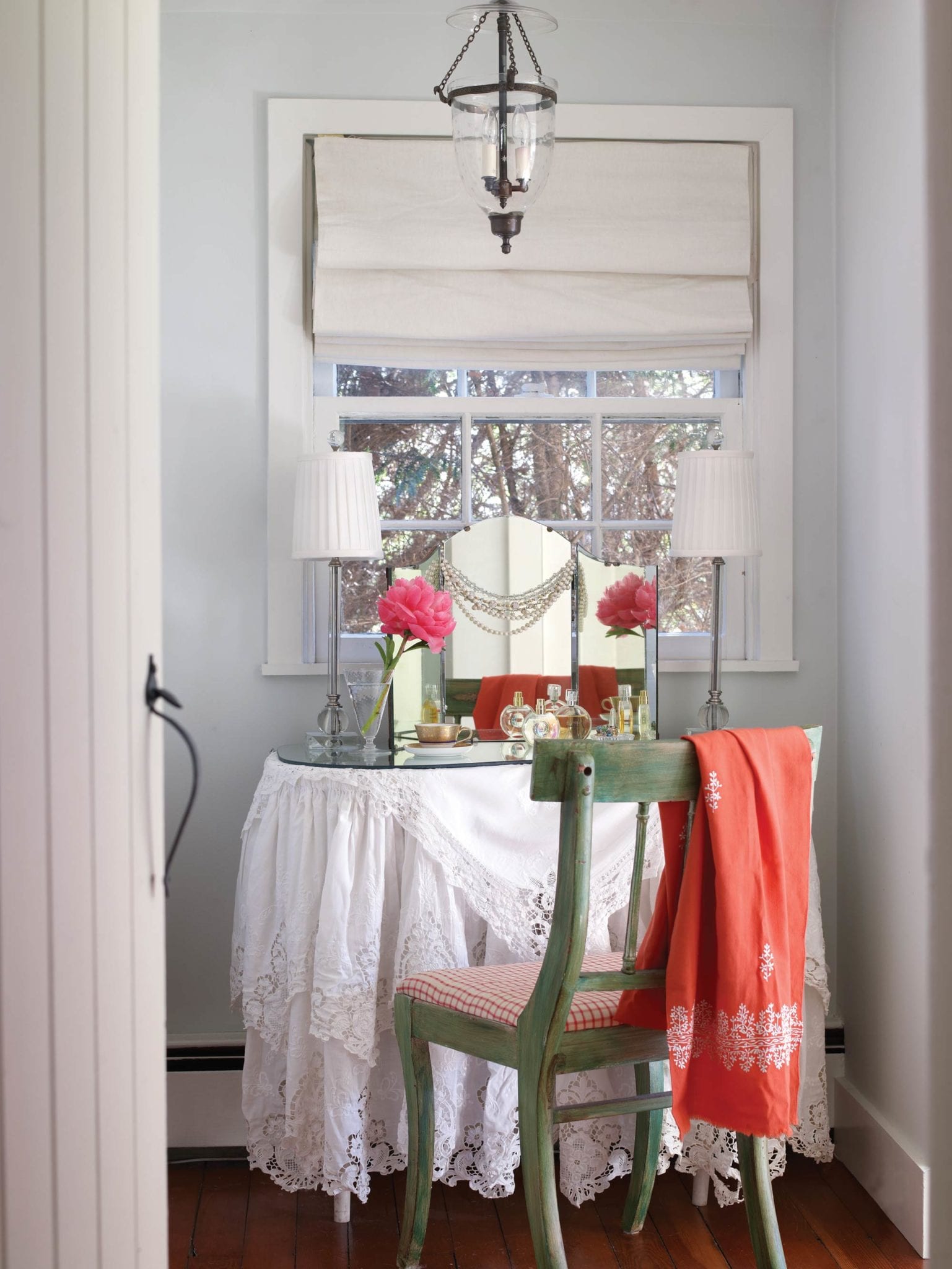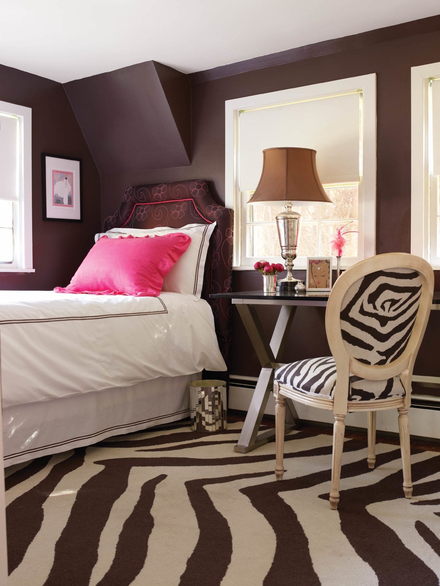 The triplets are now freshmen in college and will be on their own in a few years. Karlan will be a true empty nester soon enough, so it was important that she create her own getaway now in the form of a soothing master suite. She painted the beams on the steeply pitched ceiling white to show off the room’s height, while a custom headboard mounted on one wall sits surrounded by windows. “There’s a reduction of distraction in here,” she says. “There’s no TV, no desk; I wanted it to be pretty, serene, relaxing, very simple.”