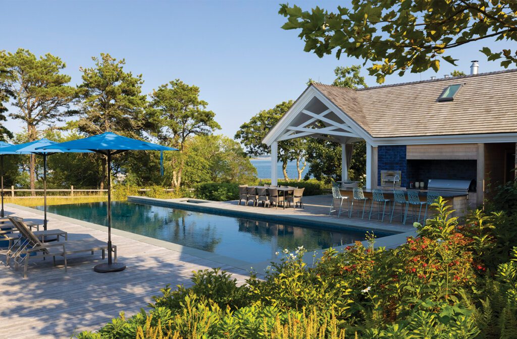 A waterfront home includes space for dozens of houseguests to go for a dip—and dry off.