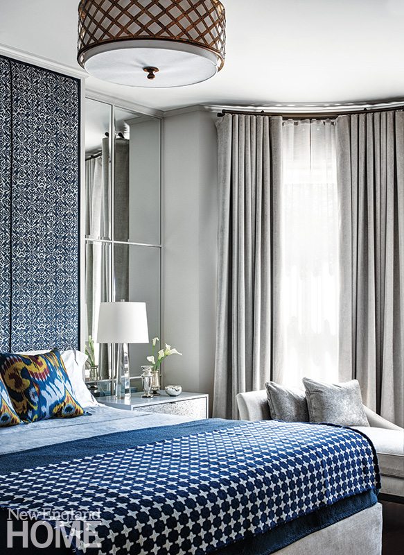 The fourth level of the house is given over to the master suite (sons’ rooms and guest rooms take up the top floor). Shades of blue and gray give the bedroom an airy in-the-clouds feeling conducive to sleep. The master bath makes use of four kinds of tile in myriad shades of blue with trim and fixtures in white for a spa-like space to ease away the day’s stress.