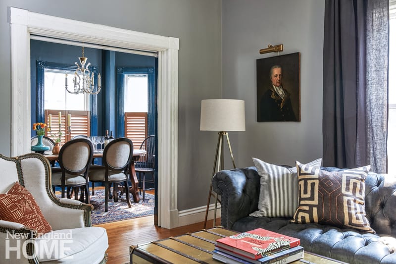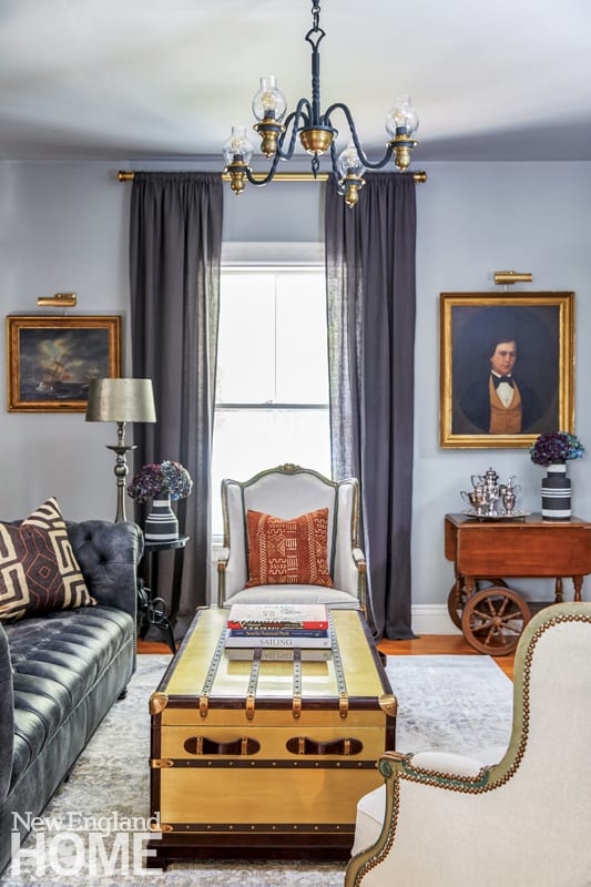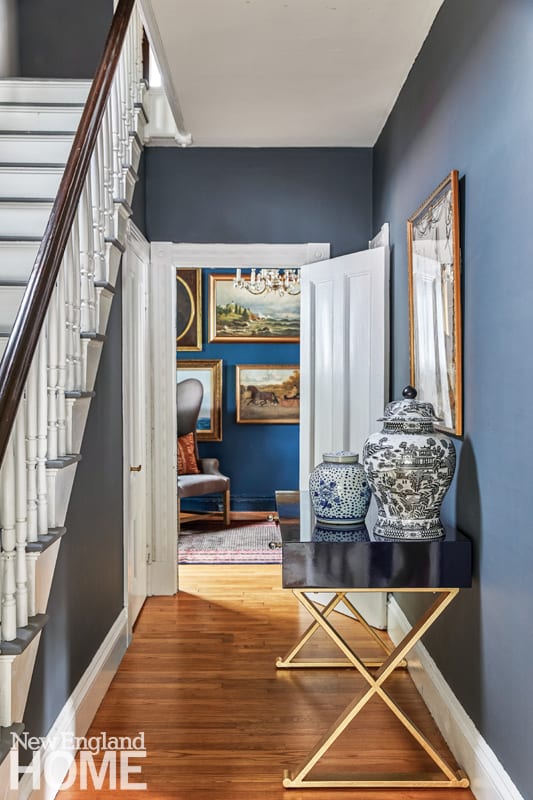 While Jared’s main decorating goal was to respect the history of the home, Karu encouraged him to venture outside his comfort zone with finishes and furnishings that would bring the Greek Revival house into the twenty-first century. Because her clients prefer cool colors, she traded the home’s watery pastels for a moody array of blues and grays from Farrow & Ball. (“They do a very good job of mixing colors that are appropriate to old New England homes,” the designer notes.) Jared did all of the painting himself—often while working. “I’m on a lot of conference calls, so I would be talking while rolling,” he recalls with a laugh.