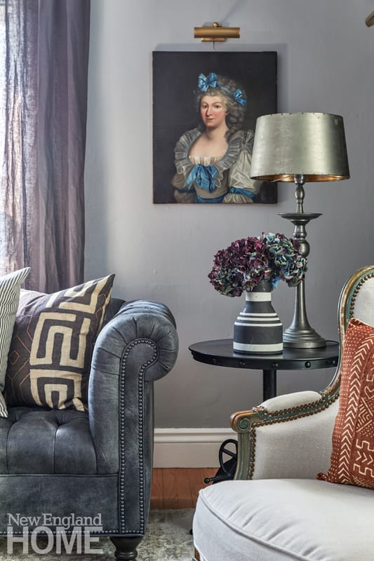 In the living room, which doubles as the family’s TV room, portraits from the eighteenth and nineteenth centuries surround a kid-friendly leather Chesterfield, a sturdy trunk table, and a pair of precious 1830s French bergères (covered in ecru linen, no less). “Our house is not a museum,” Jared says, nonchalantly. “If they survived 150-plus years, I think they’ll handle our children.” To keep the room from feeling too formal, Karu framed the windows with gauzy linen curtains and added throw pillows fashioned from ticking and African Kuba cloth.