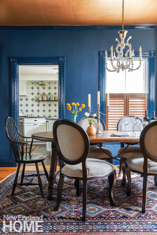 Jared had always dreamed of having a room that was entirely blue, so Karu chose a majestic Hague Blue for the dining room walls and trim. Once the paint went up, the off-white ceiling felt drab by comparison, so Jared picked up his roller and painted it a sumptuous burnished gold. “It doesn’t read as metallic when you’re in there; it just gives off a kind of glow,” Karu says, approvingly.