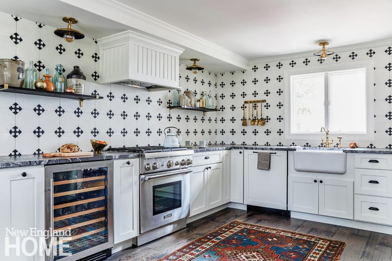 There’s no doubt what the big moment is in the kitchen. Working with Frohmiller Construction, the designer gutted the room, replacing the upper cabinets with graphic expanses of black-and-white cement tile. (A separate pantry compensates for the lost storage.) “We wanted the kitchen to be fairly timeless,” Karu says, “but we also wanted that ‘wow’ moment.”