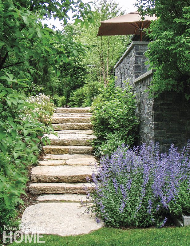 one holding the new garage—Keith LeBlanc conceived a yard and gardens that enhance the property’s assets while disguising its imperfections. Native plants and trees bring texture to the front while highlighting the entrance and delineating the new parking court. In back, a series of stone stairways, terraces, and walkways complements the house’s stonework. A swimming pool seems to float in the lawn, and at its far end a screen of trees softens the appearance of the tennis court. In the tight space next to the neighbor’s yard, LeBlanc treated the new wing like a garden wall, tucking in a walkway and steps bordered with perennials.