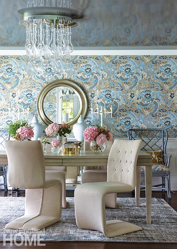 The soothing gray and blue palette flows into the adjoining dining room for harmony. To signify more adult dining, though, this space includes a chic Thibaut chinoiserie wallpaper and a flush-mounted Murano glass chandelier.
