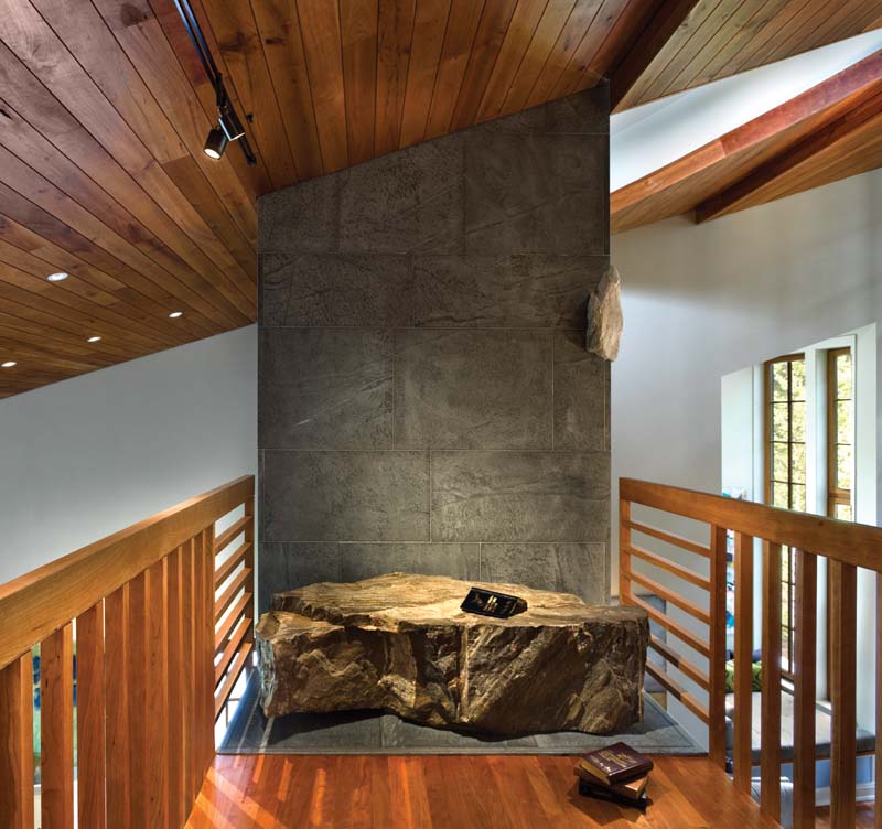 Several were inserted into the massive soapstone fireplace to break up the mass. “They seem to float in the soapstone like clouds,” says Simon. Others are artfully placed within the interior fieldstone walls. A massive specimen winched into place on the second-floor catwalk hallway serves as a bench.