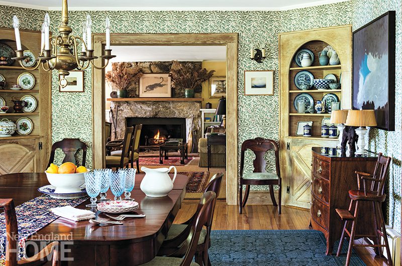 Even elements that were less than ideal were preserved. The upstairs hall’s quirky interior windows, for instance, compromise privacy, but they stayed. Robinson was advised to replace the French doors in the living room with windows, but that would have altered an important architectural detail, so the doors still stand. All of the old natural wood trim, as well as doors and their hardware, remained in place, too. The interiors were furnished under the guidance of New York City interior designer Kerry Wilson, who says the house is a reflection of the homeowners. “I helped them with paint colors, fabrics,” says Wilson. “We repurposed some pieces and moved others. This home had belonged to Roxana’s grandparents, and my role was to help re-imagine it for her.”