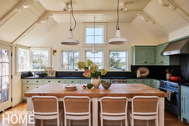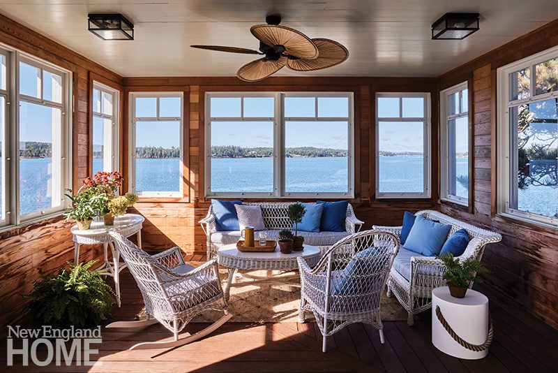 With the exception of the great room, the house needed to be gutted in order to install new insulation, electrical, plumbing, and heating systems. While the residence’s footprint remained the same, the layout was tweaked in certain areas. On the main floor, a rabbit warren of small spaces—including two former maids’ rooms—were reworked to form a larger kitchen, a guest room, and a guest bath. An open porch became a three-season room overlooking the water.