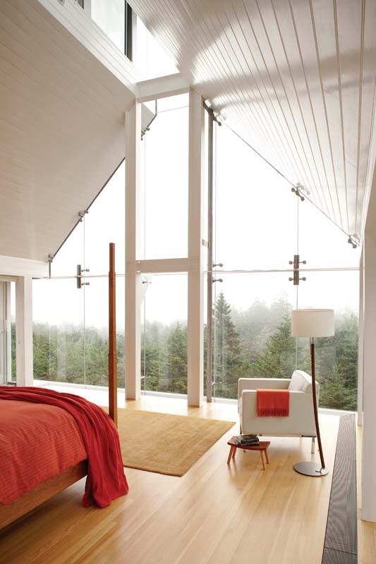 The stairs have handsome white oak treads and risers over structural lead coated copper; a tactile white oak handrail crowns the stainless steel cable railings. White oak floors lead to rooms clad with horizontal white beadboard. In the living room and the master bedroom, the walls melt away into transparency. Manufactured to stringent specifications in Italy, this glass has none of the green hue common to the material. On the second floor, the slanted horizontal board ceiling reaches up towards the clerestory. “Breaking through the roof with the clerestory was much like piercing a roof with a chimney,” says Corey Papadopoli, a Bar Harbor–based architect who, at the time, worked with Peter Forbes. “The clerestory is lined with aluminum frame windows; they open to draw hot air up and out of the house. The design posed the same issues as a chimney: the challenge of keeping water out, which called for flashing.”