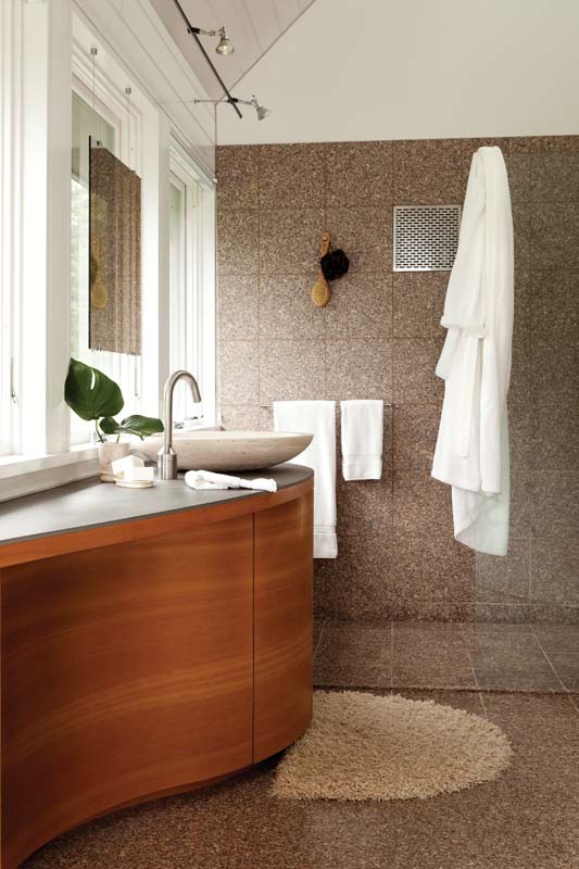 The master bath embodies the spirit of the house with a curved vanity, an Italian travertine vessel sink, honed granite walls and floor and, hung before a window, “the world’s coolest mirror,” says Forbes. “It’s a one-way mirror that becomes transparent at night. It still reflects, but you also see through it to the woods outside.”