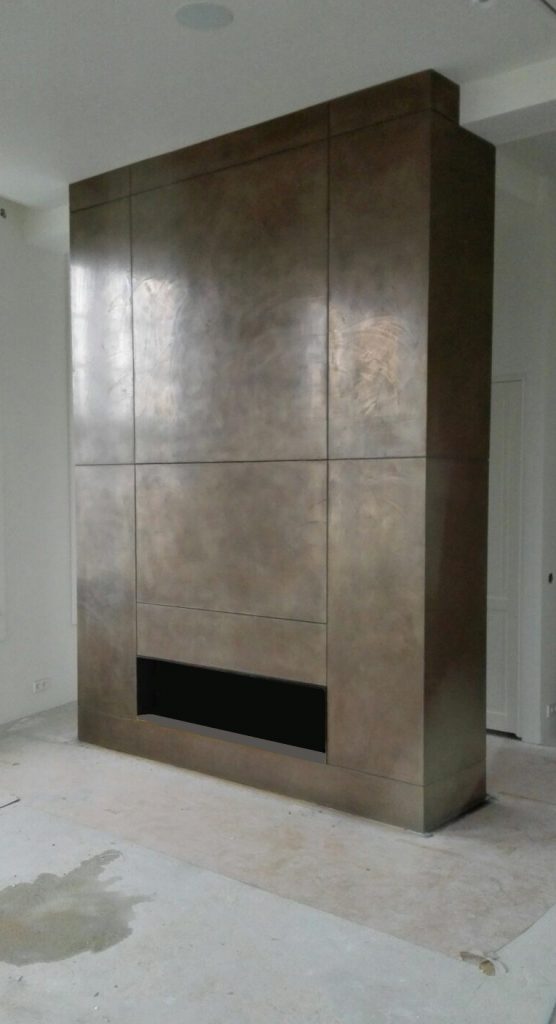 It’s not a metallic paint, but rather a liquid cold applied metal application consisting of metal powder, binder, and hardener. It can be sprayed on for a smooth finish, or applied with a trowel for a mottled or patinated look. It’s available in both solvent-based and water-based versions.