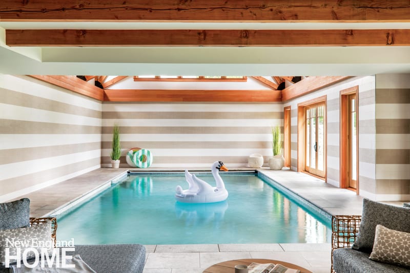 For most New England families, gathering around the fireplace might involve books or board games played while wrapped in a comfortable throw—not relaxing in a swimsuit, wrapped in an inflatable swan. Unless, that is, there’s a 10,000-gallon swimming pool a few steps from the hearth.