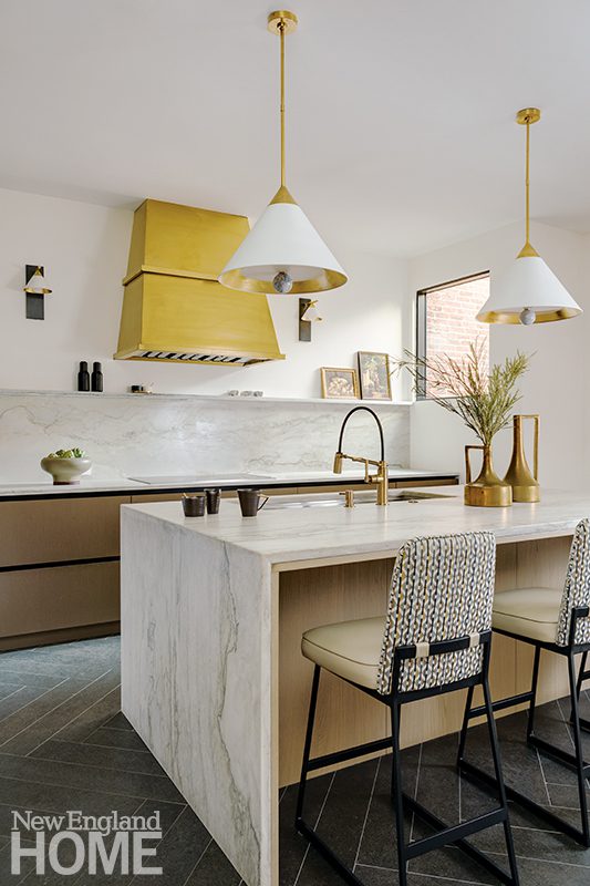 After living in the same townhouse in the Boston neighborhood of Charlestown for twenty-five-plus years, two homeowners looked around their dated space with its 1990s cherry cabinetry, Tuscan-style tile, and awkward primary suite layout and decided enough was enough. While scrolling through modern kitchens on Instagram, the wife stumbled upon Jill Najnigier’s sophisticated designs, and she reached out. The two became instant friends. It didn’t hurt that Najnigier’s office is a stone’s throw from the circa-1852 home.