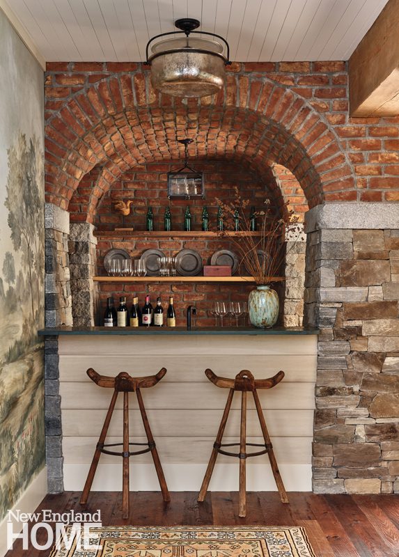 Modeled on a bank barn, which has entries on two levels, the timber-frame structure is awash in sepia hues, offering a warm respite when temperatures plummet. Pale poplar paneling treated with a translucent whitewash alternates with tinted plaster walls, which Housewright Construction applied in a rough-hewn “brown coat” to suggest the textured finish one might find in a real barn. A tapestry of ruddy reclaimed hemlock animates the floor underfoot, its rough-hewn demeanor tempered by custom hooked rugs that nod to traditional New England handiwork.