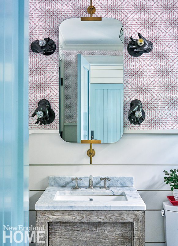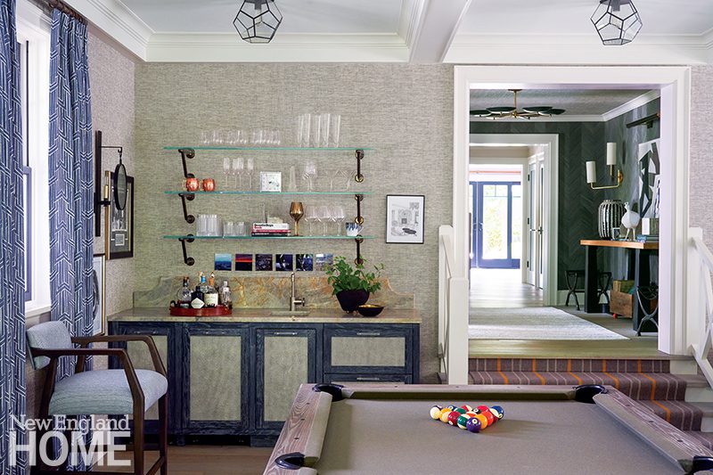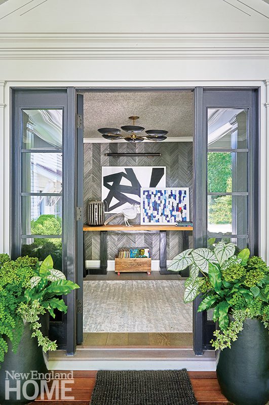 Sanders removed a bathroom to create a new front entry that aligns better with the home’s approach, while Filicia filled the resulting foyer with a dramatic ebonized-wood wallcovering, a grasscloth ceiling, a Sputnik-style pendant, and a console table loaded with personal effects. “I love making rooms like that a little more dramatic, because you’re only in them for a short amount of time, and you want them to be memorable,” the designer says.