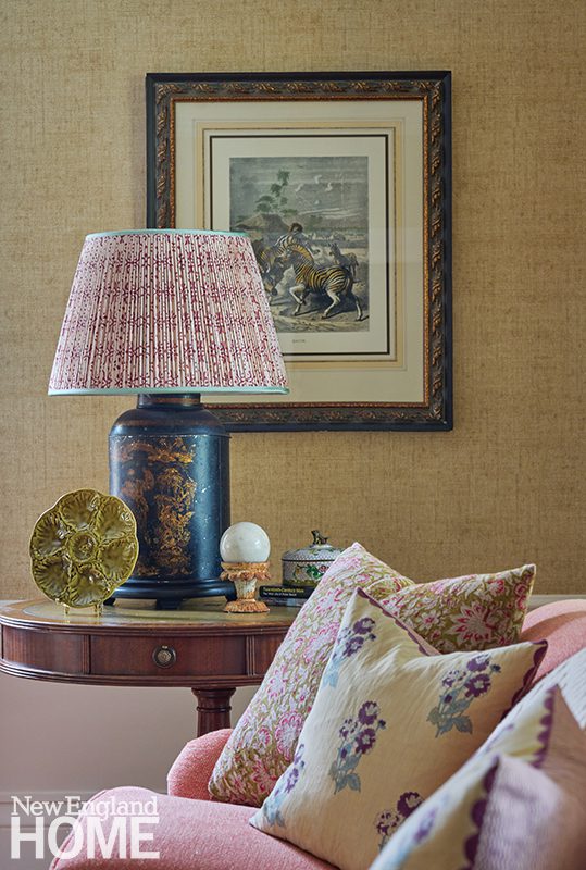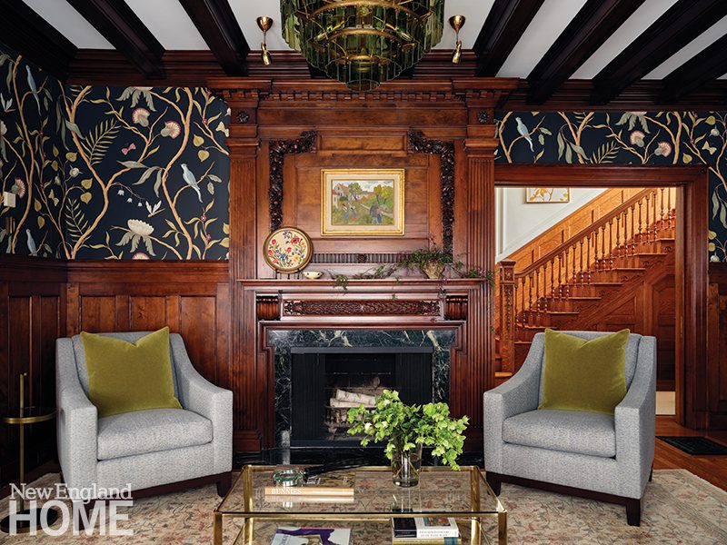 The living room in this stately 1869 Newton, Massachusetts, home was rich with period details: quartersawn-oak woodwork, leaded glass, and coffered ceilings. But mostly, says interior designer Sarah Cole, it was dark. “The client wanted to update and brighten a very grand space,” she says, “and I knew it would take more than a refresh. Painting the woodwork was out of the question.” Instead, the Newton designer leaned into the room’s drama, embraced its history, and lobbied for a surprising inspiration piece: black Lewis & Wood wallpaper with a botanical vibe. “I persuaded the client that dark paper would soften the contrast of the wood and allow the furnishings to stand out,” Cole says. She gave new life to some older pieces by changing out fabrics and worked with Julie Mussafer of Jules Place to select new art. Table lamps with petal-like bases tie everything together, says Cole. “We picked up the branches and wood tones of the wallpaper throughout the design and introduced a bit of a garden theme.”