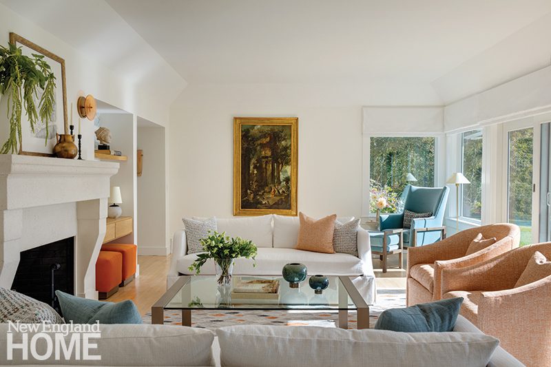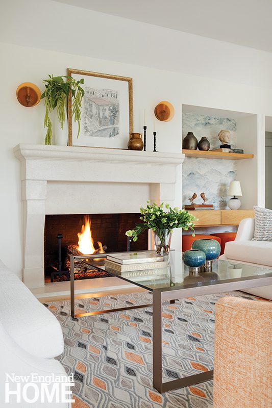 A nod to the past and love for the client’s ancestral home inspired this gracious living and entertaining space in Osterville, Massachusetts. “The family has roots in the Abruzzo region of Italy, so we wanted to honor that, even as we did a down-to-the-studs renovation,” says interior designer Jill Najnigier of JN Interior Spaces in Boston. Najnigier used a large, moody painting from the client’s collection as the starting point, “which instantly gave the room a sense of place.” She commissioned artist Pauline Curtiss to make an etching of the client’s childhood home; it now occupies a place of honor above the mantel. Clay roof tiles from their current home in Italy morphed into sconces that hang near the entry to the room. Najnigier found the Stark wool-and-silk rug early in the design process, and it inspired the custom glass-and-brass-finish coffee table. The room’s ample seating includes Thom Filicia for Kravet sofas and a pair of swivel chairs that allow for both conversation and a glimpse at the water outside the windows.