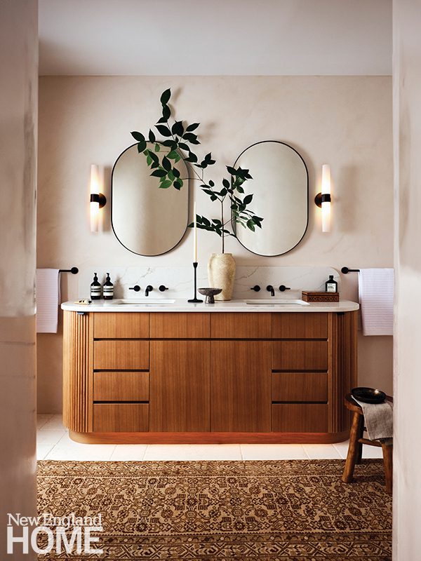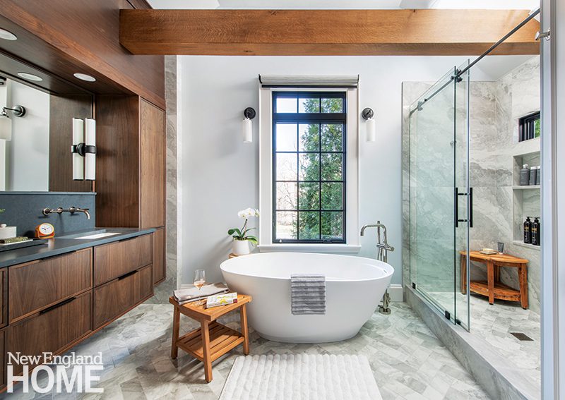 This primary bath is detailed, but it still presents as a sleek, minimalist space, “with a mildly rustic feel,” says Rachel Brooks of Feinmann, Inc., a design/build firm in Lexington, Massachusetts. The bath underwent a significant expansion, says the project designer, whose firm was solely responsible for the room’s transformation: architecture, construction, and interiors.