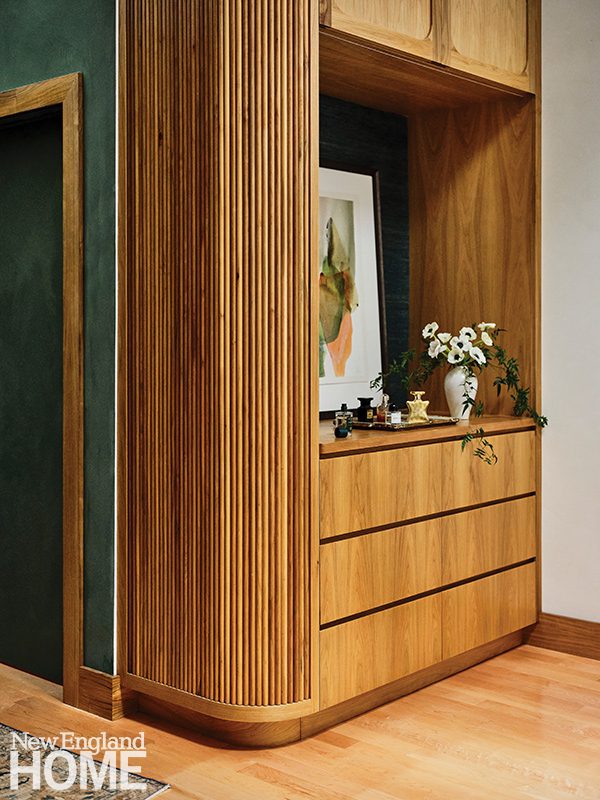 Curved corners softened the bath while blush-toned Venetian plaster lightened it up. Bold casework abounds; the striking tambour walls and cabinetry are made of bleached walnut; the rest of the millwork is white oak.