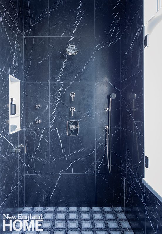 and a velvety look. For the shower walls they went with Nero Marquina marble tiles from Ann Sacks. The shower’s window is frosted even though there’s plenty of privacy, says Hill, “because it is the penthouse, after all.”