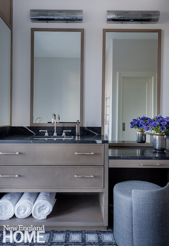 They chose oak for the custom storage towers on both sides of the vanities and makeup table between them. Leathered marble counters add durability