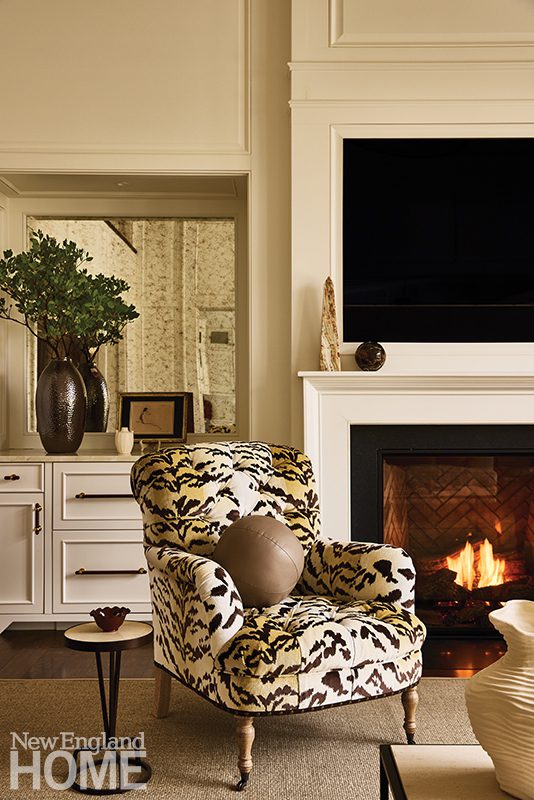 The goal of this Hingham, Massachusetts, living room renovation, according to designer Lindsey Crowley, was to create a cozy, sophisticated, and tailored space for the clients to gather with their children, grandchildren, and friends. Crowley collaborated with architect Andrew Silipo on everything from new millwork profiles to adding beadboard on the ceilings. “There’s a level of architectural richness that the client needed in order for this house to feel like home,” she says. In addition to swapping out the fireplace surround for a cleaner painted wood version, the design team installed new built-ins backed with antiqued mirror panels. When it came to the furnishings, Crowley selected pieces in line with the clients’ traditional style in a neutral palette with pops of blue—the wife’s favorite. But the “shining stars of the room,” according to Crowley, are the animal-print chairs. “The Nobilis fabric is the first thing we purchased, and we designed the entire room around it.”