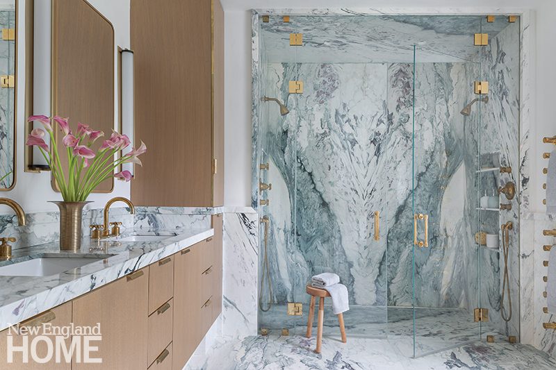 But it’s the small details that really take this space to another level: the integrated unlacquered brass hardware, for instance, “will patina over time and add another layer of depth,” notes Graneto. And the stone itself is carried through from the shower and countertops to the floor, wainscoting, and trim. “We used the stone in an architectural way and even continued it around the windows and doors.”