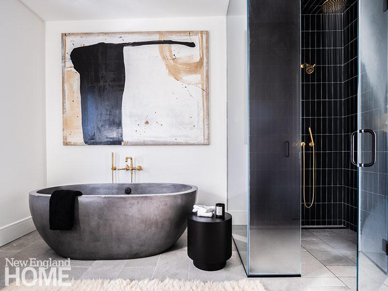 Designer Kelly Mittleman joined this Newtown project in the nick of time. “The house had just been framed, and we realized during the walkthrough that the primary bath didn’t seem grand enough,” she explains. “Luckily, we were able to move it to a different location with more space.” Another major benefit of reworking the floor plan is the room’s view, which features an expansive countryside vista as opposed to the street. Mittleman prioritized a luxurious, spa-like feel, installing a concrete soaking tub, a steam shower, and radiant heat flooring along with bold Nero Marquina marble countertops. “The concrete feels organic and reflective of the outdoors,” says Mittleman, who notes that it took quite a crew to maneuver the 900-pound tub into place. “We played with light and dark, bringing in some moodiness with the black elements. I also love placing large-scale modern artwork in a bath because it’s fun and unexpected.”