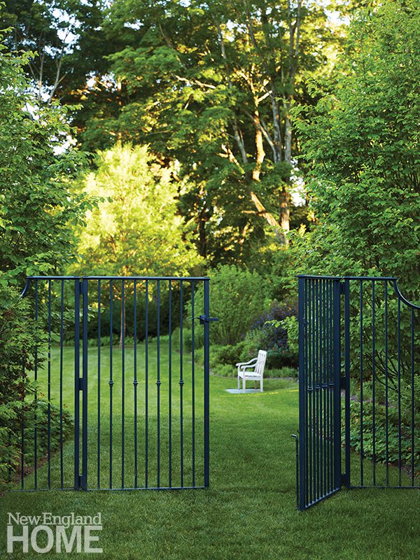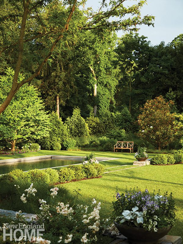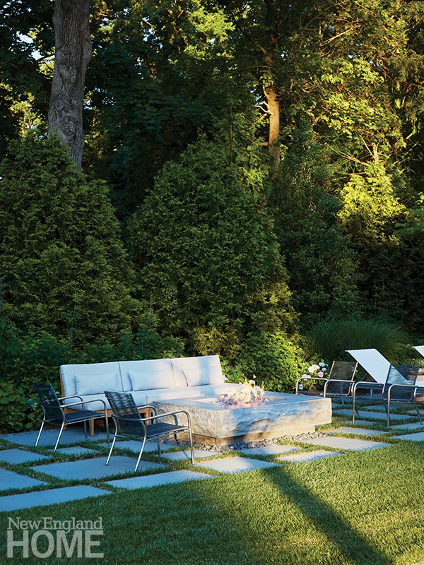 She defied traditional central placement of the swimming pool, instead setting it off slightly to the side and down a step. “Because this is the Northeast, we didn’t want to be looking out on a pool cover most of the year,” she says.
