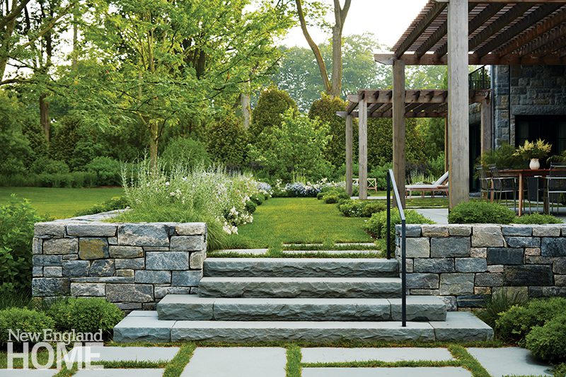 Byers chose the same fieldstone for the low walls that delineate the garden’s spaces. Stairs, pavers, and pool coping are New York bluestone.