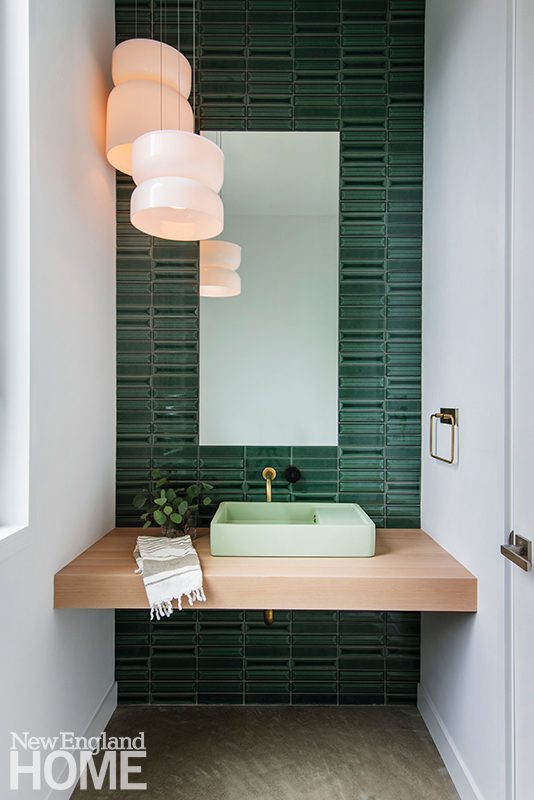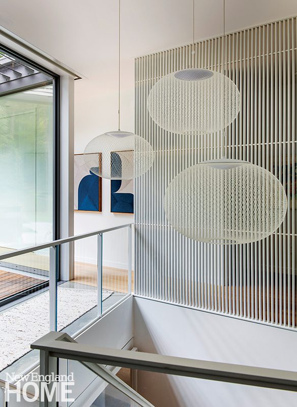 Blonde oak ceilings add a warming touch to some of the rooms, as does the decor, overseen by Lindsay Bentis of Thread Interiors, who’s also a California native. “They wanted it to be this very modern structure, but the wife didn’t want it to feel cold,” Bentis says. “So we layered in textures, colors, materials, and shapes to create a warmer vibe.”