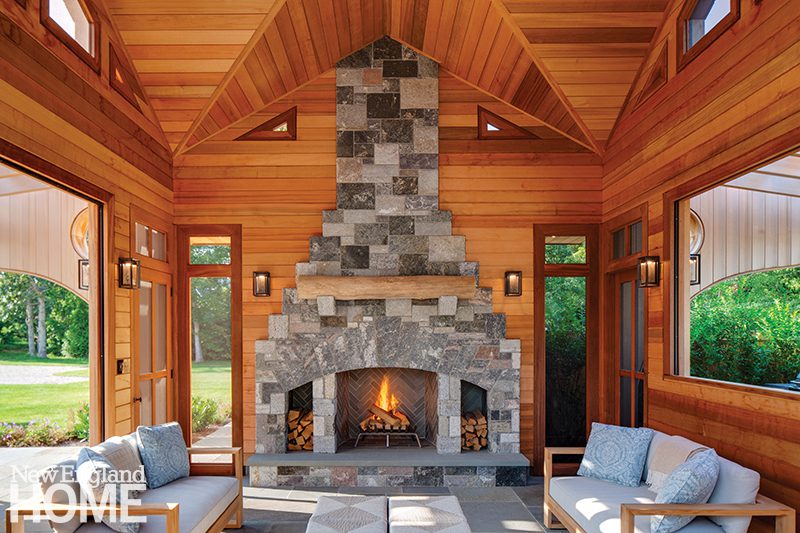 Those parallel pergolas, whimsical elements in their own right, serve a purpose: they shade the pavilion’s alfresco dining area and kitchen. Inside, the red-cedar-clad structure houses a vaulted-ceilinged sitting area and a granite fireplace that is visible from the home’s new family room addition, also designed by PSD. (That room’s ceiling trusses also feature, you guessed it, shark faces.)