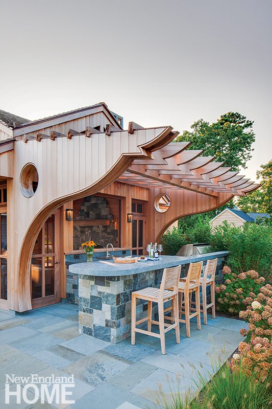 “The homeowners wanted a fun, lighthearted place for entertaining— something that was consistent with the character of the existing house,” says design principal John DaSilva, referring to the couple who purchased a home his firm, Polhemus Savery DaSilva, designed nearly a decade ago. “They liked the idea of using whimsical details. If you look at the ends of the rafters and brackets that comprise the cantilevered pergolas, you’ll see shark faces.”